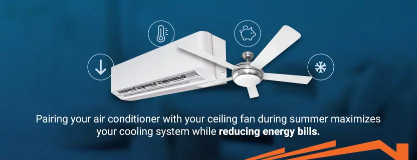 Around 12% of the total energy use of households in the United States comes from air conditioners, totaling around $29 billion annually. Pairing your air conditioner with your ceiling fan during summer maximizes your cooling system while reducing energy bills.