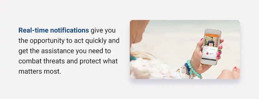 Whether you’re at the grocery store or relaxing in the backyard, you’ll instantly get a message if it’s time to take action. Real-time notifications give you the opportunity to act quickly and get the assistance you need to combat threats and protect what matters most.