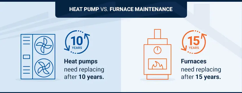 Both furnaces and heat pumps need regular maintenance to prevent issues. Heat pumps need more frequent checks since they run year-round. With constant runtime, there’s always wear and tear to fix. Furnaces are mostly used in the winter, so you have fewer maintenance expenses. Typically, heat pumps need replacing after 10 years — 15 for furnaces.